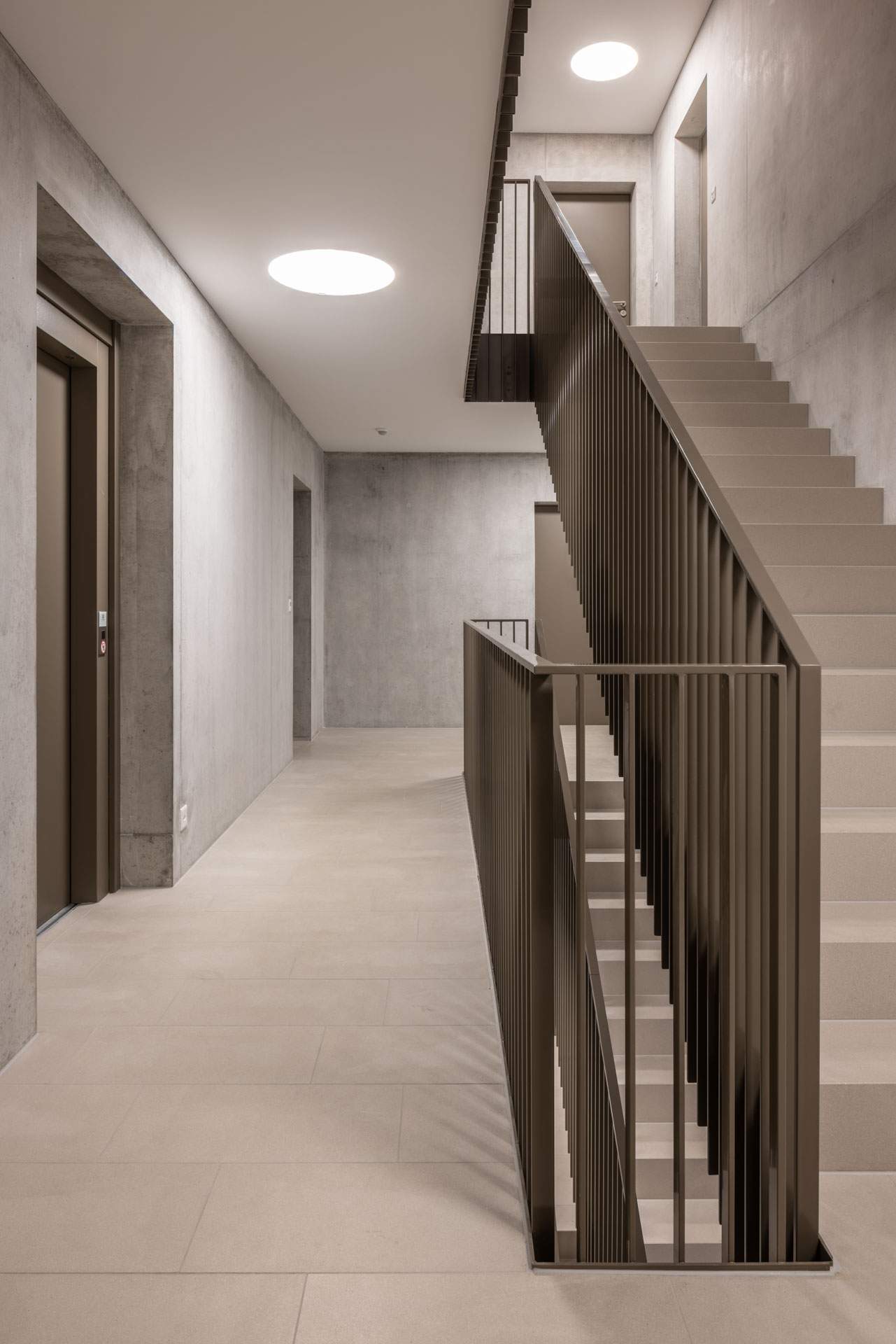 Die dem Hangverlauf folgenden Rampen und die abgerundeten Wände schaffen fließende und spannende Innenräume. Die in Ellipsenform erstellten Kerne mit WC-Anlagen, Technik und Gruppenräumen gliedern das Gebäude in zwei Haupträume und Erschliessung. Diese verbindet den Hartplatz mit dem Aussenraum des Kindergartens. Die auskragenden Vordächer und Aussenwände der Kerne thematisieren die innere Formensprache und Materialisierung und tragen das Konzept nach aussen.