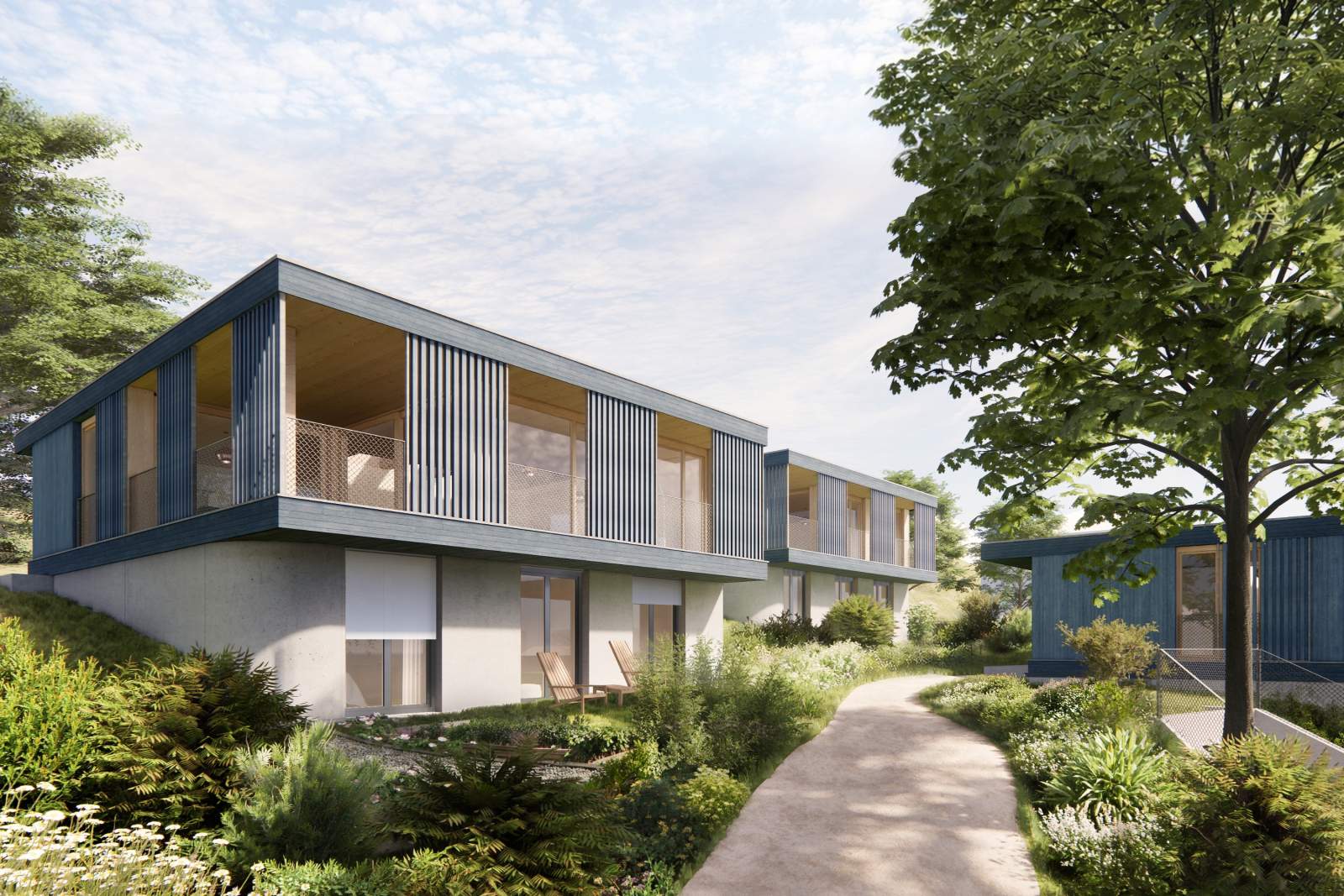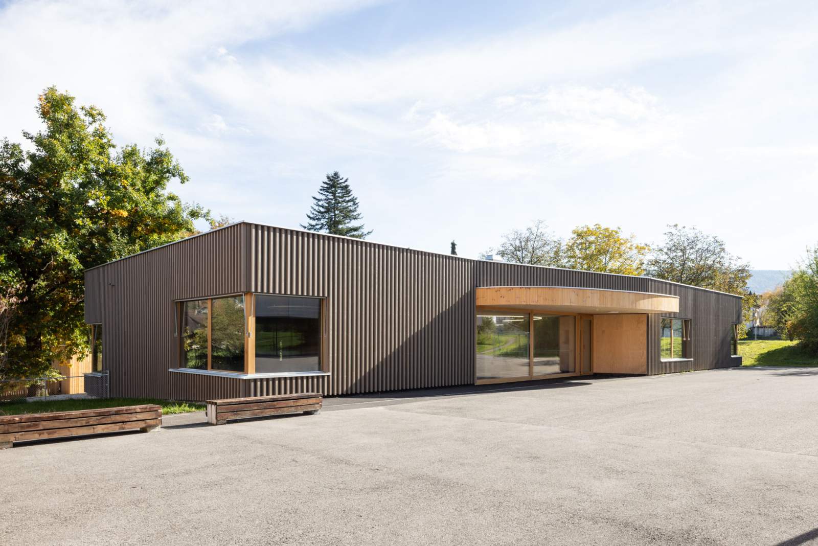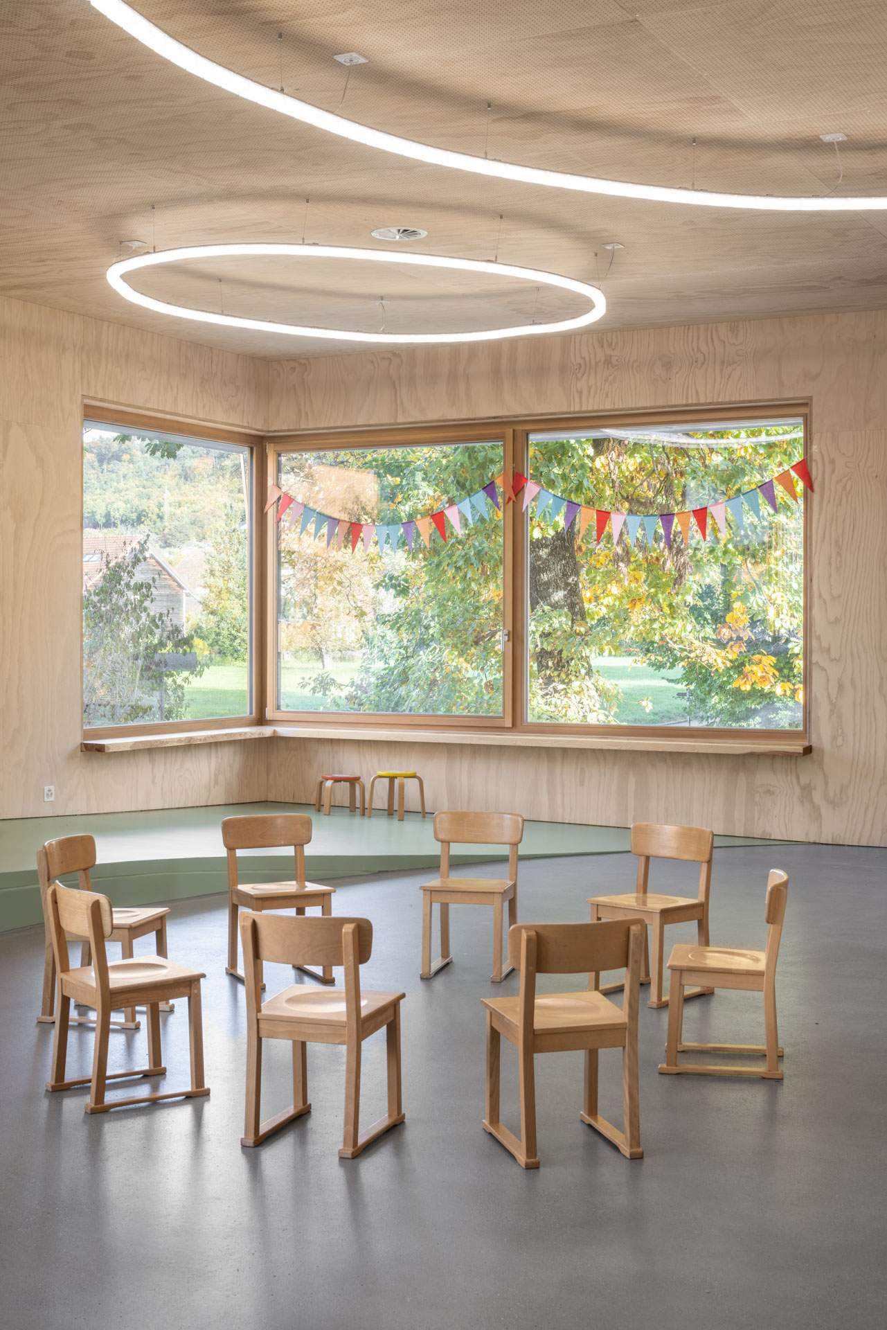 Indem er sich an die Hangkante und in die Flucht der Schule stellt, schließt der Kindergarten den Hartplatz räumlich ab und vergrößert den Schulkomplex auf selbstverständliche Weise. Im Gegensatz zu dem Schulhausanbau mit orthogonalem Grundriss und aussen abgerundeten Ecken zeigt sich der Doppelkindergarten mit klarer Aussenform und spielerischen Formen im Innern.