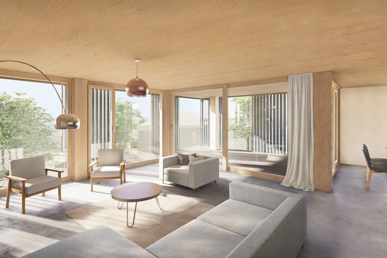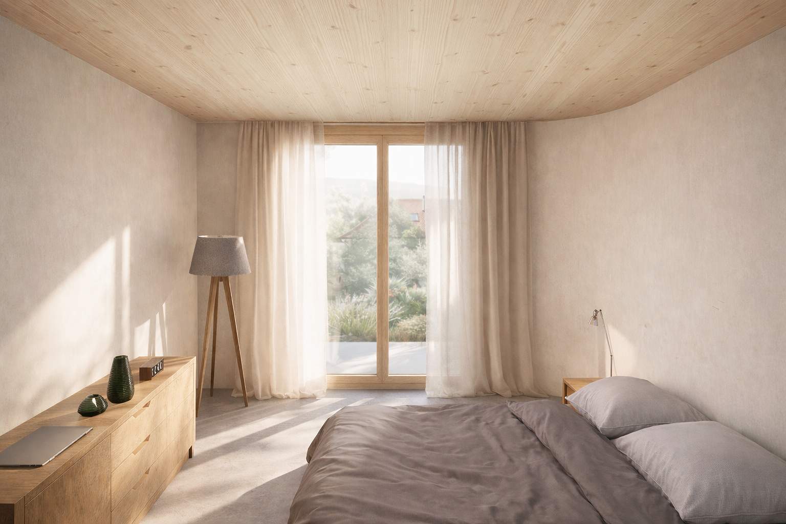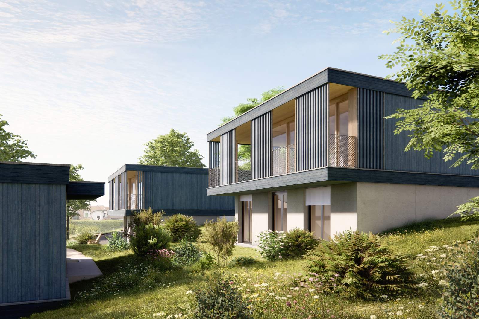 Indem er sich an die Hangkante und in die Flucht der Schule stellt, schließt der Kindergarten den Hartplatz räumlich ab und vergrößert den Schulkomplex auf selbstverständliche Weise. Im Gegensatz zu dem Schulhausanbau mit orthogonalem Grundriss und aussen abgerundeten Ecken zeigt sich der Doppelkindergarten mit klarer Aussenform und spielerischen Formen im Innern.
